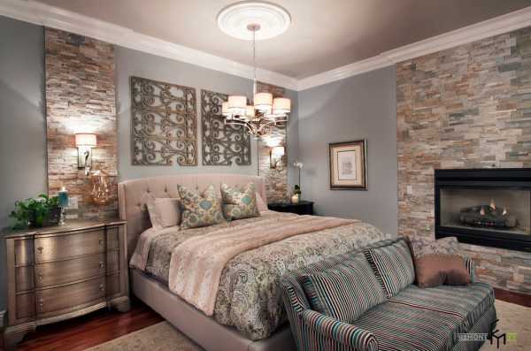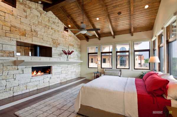 Использовать натуральный или искусственный камень можно в отделке практически любых поверхностей, но в спальне, как правило, камнем выкладывают стену, часто у изголовья кровати. В сочетании с деревянными балками потолка, именно этот природный материал задает тон всему помещению, добавляя роскоши и стиля.