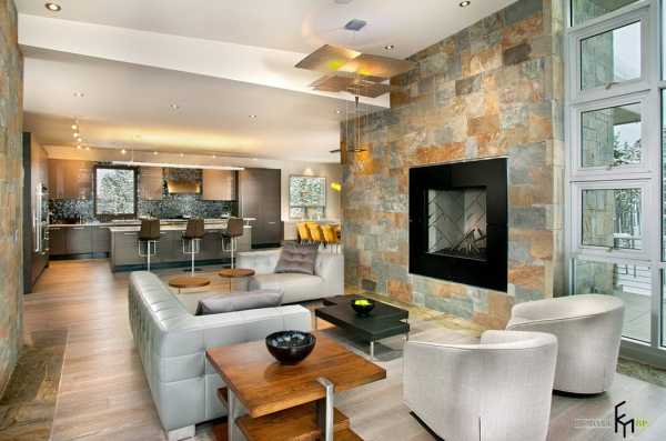 В интерьере современной стилистики камень смотрится вполне уместно. Искусственный материал позволяет подобрать цветовую гамму, способную сочетаться с общей палитрой гостиной комнаты или наоборот – выступать эффектным контрастом, все зависит от того, какие цели преследуют жильцы, применяя камень в отделке помещения.