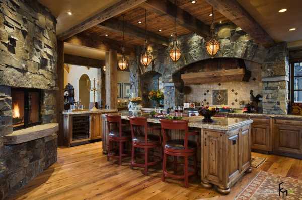 В этой кухне камень присутствует повсюду – в отделке стен и кухонного фартука, в составе столешниц кухонного острова и рабочих поверхностей. Благодаря разнофактурности и умело подобранной цветовой гамме, помещение смотрится роскошно. Создается впечатление, что мы заглянули в кухню, где готовятся изысканные блюда для высокопоставленных персон королевского двора.