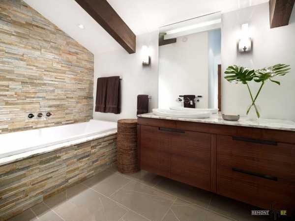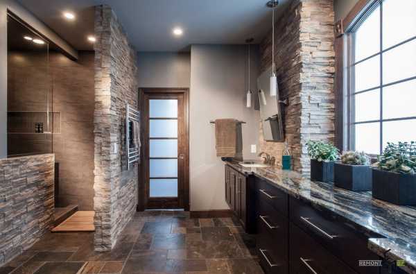 Просторная ванная, стены которой почти полностью облицованы каменным отделочным материалом, создает настрой на расслабление и отдых. Нотки японского стиля, в котором, как правило, присутствует контраст цветов и натуральная зелень, настраивает домочадцев на бесконечный дзен.