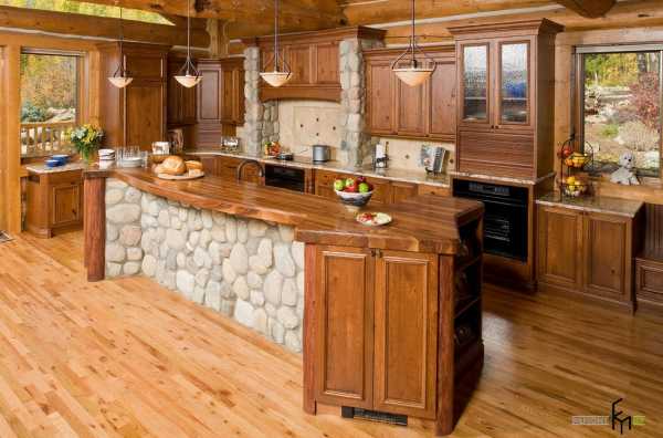 Традиционная для загородного дома кухня. Где древесины используется в отделке стен, пола, потолка и меблировке прекрасно разбавляется камнем в виде очень крупной гальки. Несмотря на внушительные размеры, эти светлые элементы привнесли легкость в атмосферу кухонного помещения.