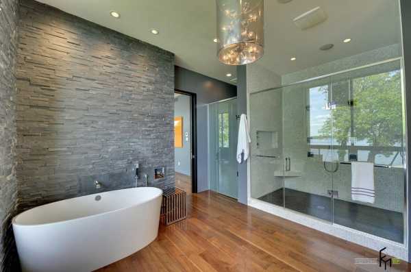 Для создания уникального экологичного дизайна ванной комнаты натуральный камень подойдет как нельзя лучше. Использование крупной гальки внутри помещения позволяет продлить тему природы, которую видно из огромных, от пола до потолка, стеклянных дверей.