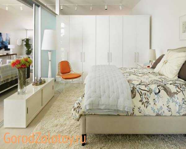 Вместо сотни полок и ящиков — встроенный шкаф купе с зеркальными дверями. Они не только визуально расширят пространство, но и избавят от необходимости поиска места для полноценного зеркала.