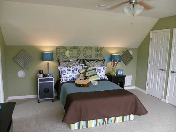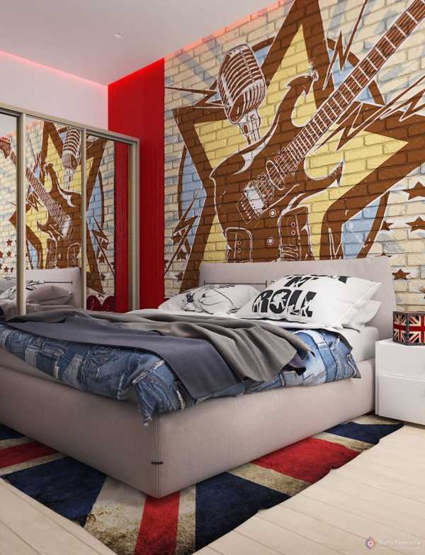 Помогите в оформлении комнаты ребенку, если он очень увлекается роком. Примените в окрашивании стен такие цвета, как бежевый и серый, можно сделать модное граффити на стене или поместить фото кумиров.