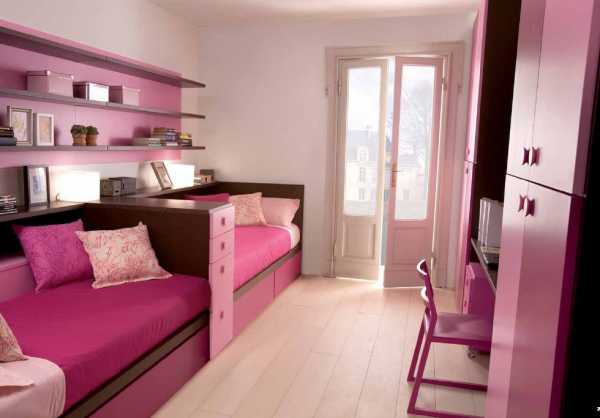 В качестве мест для хранения можно использовать большой шкаф-купе и несколько ящиков, к примеру, под кроватью. Но раздельные хранилища предпочтительнее, так как девочки могут путаться в вещах или даже затевать по этому поводу ссоры.