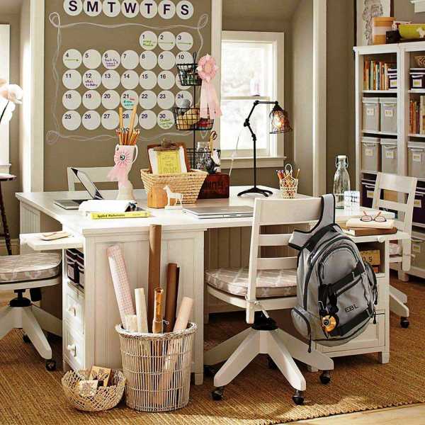 Если площадь спальни позволяет, рабочие зоны лучше разместить в разных углах комнаты — чтобы девочки не отвлекались во время выполнения домашнего задания. Несмотря на совместное проживание, у них должно оставаться небольшое личное пространство.