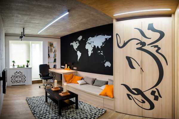В нем включены некоторые особенности стилей Хайтек и модерн. Для отделочных материалов можно использовать яркие цветовые решения, тканевые шторы.