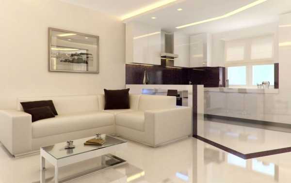 Разделение комнат также осуществляется напольным покрытием. Например, разноцветной керамической плиткой. Для отделки гостиной используется плитка с рисунком, а для рабочей зоны – однотонную. Помимо этого, отделочного материала хорошо смотрится ламинат разного цвета и текстуры, иногда одну зону поднимают на подиум.