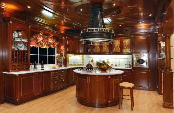 Не должно быть никаких неровностей и недочетов, она должна производить впечатление качества и добротности. Допустимо использование рельефной штукатурки; - Отделка натуральной древесиной – один из наиболее удачных вариантов отделки в кухни классическом стиле. Благородство дерева будет как нельзя, кстати, для оформления классического интерьера. Для обшивки можно использовать классическую деревянную вагонку темно- или светло-коричневого оттенка;