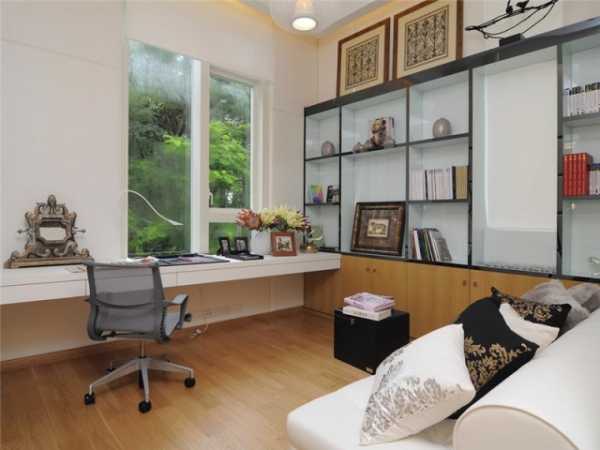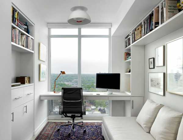 Она небольшая, именно поэтому главную роль здесь исполняют светлые оттенки. Большое окно, открытые полупрозрачные книжные полки, дизайнерская мебель белого цвета – все эти детали создают гармонию уюта.