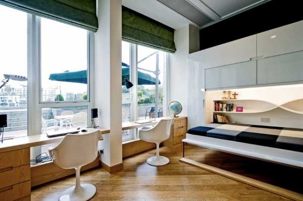 Над подоконником можно разместить столешницу, которая при необходимости может заменить полноценный рабочий стол. Поверхность мебели должна быть глянцевой, так как глянец, наряду с зеркалами, позволяет создать эффект зрительного увеличения внутреннего пространства комнаты. Отделать глянцем по тем же самым причинам имеет смысл даже пол.