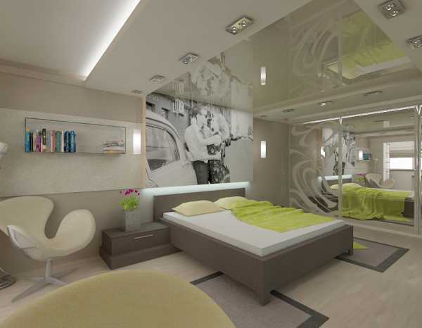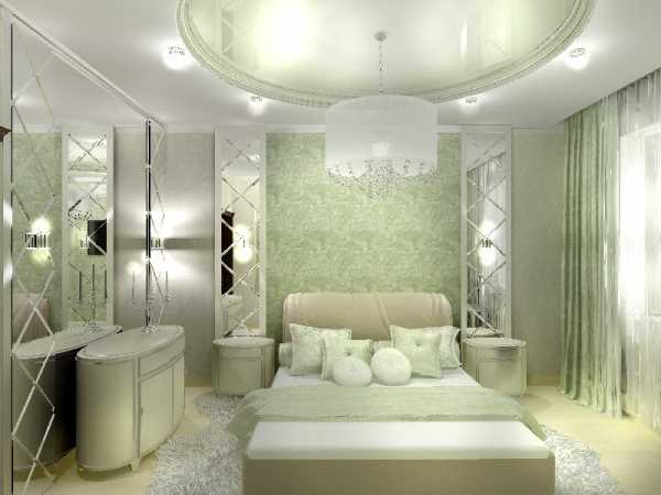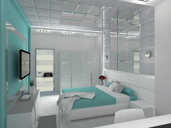 Ещё одним способом зрительного увеличения размера маленького помещения в современном дизайне является использование зеркал. Их размещают как на стенках шкафа-купе, так и на стенах самого помещения. При этом сам шкаф и вся мебель в комнате должны быть низкими, так как в этом случае потолки будут казаться высокими, она должна быть функциональной и вместительной, роскошной мебели с небольшим объёмом здесь места нет.