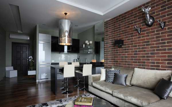 Поэтому здесь вполне допустимы элементы лофта, а именно — сохранение в качестве дизайнерского приёма неотделанных стен из бетона и кирпича.