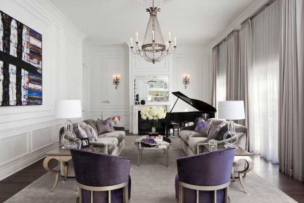 Современный неоклассицизм для гостиной в нежно-фиалковой цветовой гаммыИнтерьер и обстановка гостиной в стиле неоклассицизм