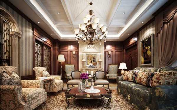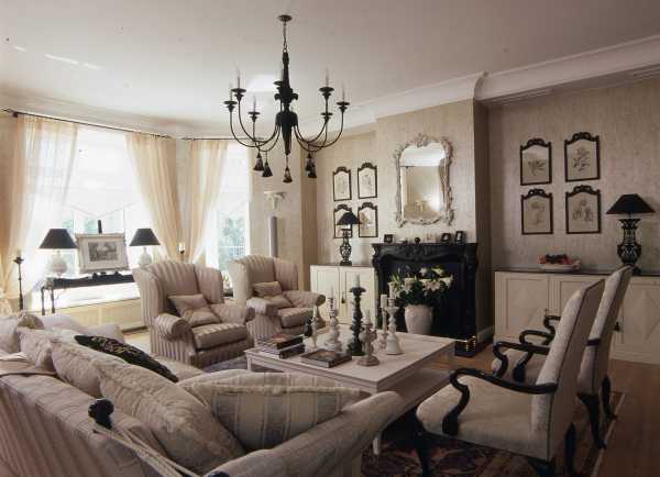 В старинных жилищах гостиная была важной частью всего дома. Здесь респектабельный хозяин принимал посетителей днем и отдыхал вечером, сидя у камина или раскидывая пасьянс со своими домашними. Паркет в гостиной из дорогих пород дерева сверху можно застелить ковром с геометрическим рисунком. Потолок выполнен в пастельных тонах и декорирован изящной лепниной. Можно использовать современные матовые натяжные потолки с деревянными панелями над люстрами и резными потолочными плинтусами по периметру.