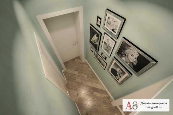 В спальню ведет небольшой коридор. Его запланировали слева от прихожей. Коридор выполнили в цвете Tiffany и отделали декоративной штукатуркой под шелк.
