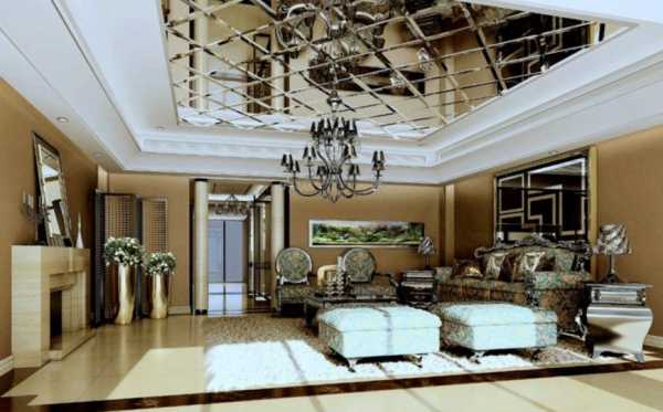 Современная гостиная с нотками неоклассицизмаМожно использовать современные отделочные материалы для потолка. Это может быть натяжное полотно с матовой или глянцевой поверхностью. Это дополнительно поможет расширить пространство.