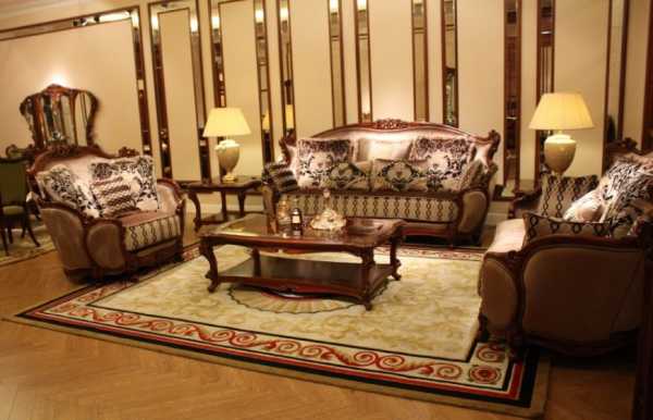 Реализовывая шикарную дизайнерскую задумку, материал используется дорогой и роскошного пошива. Шелк один из подходящих вариантов. На втором месте стоит бархат. Он придаст мебели ощущение тепла и комфорта. В этой комнате должны быть персидские ковры и ценные породы дерева.