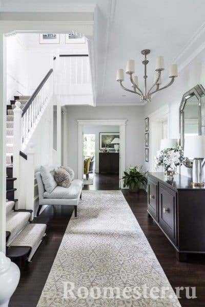 Если захотите придать полу теплый и мягкий вид не следует использовать ковролин или другие изделия из пушного материала. Так как, дизайн гостиной в стиле неоклассика должен представлять собой искусный вид, художественное произведение, а не бабушкину мягкую лачужку.