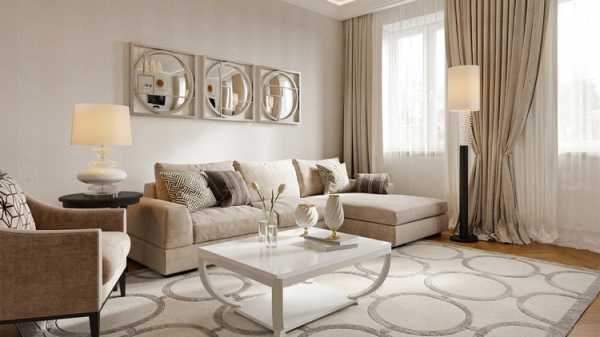 Гостиная в стиле неоклассицизм в песочно-бежевой цветовой гаммеНикогда не используйте в неоклассике узкий плинтус. Используйте только широкие изделия. Они придадут помещению больше роскоши и изящности.