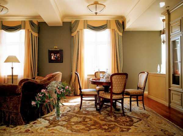 Богатый интерьер гостиной в стиле неоклассика с тяжелыми и плотными шторамиОформление благородного потолка в интерьере гостиной неоклассицизма