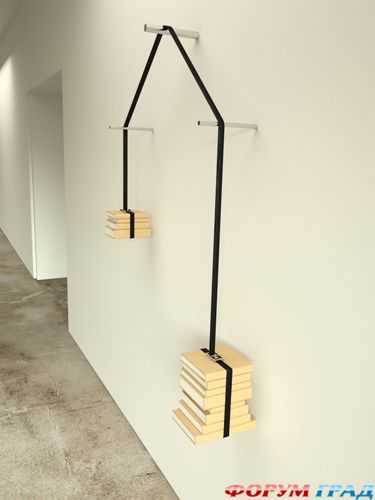 Для визуализации того, сколько еще книг предстоит прочитать подвешенные отдельно на кожаном ремне прочитанные и непрочитанные книги располагаются в пространстве по принципу механических весов. В таком красноречивом состоянии книги находятся на этой полке.