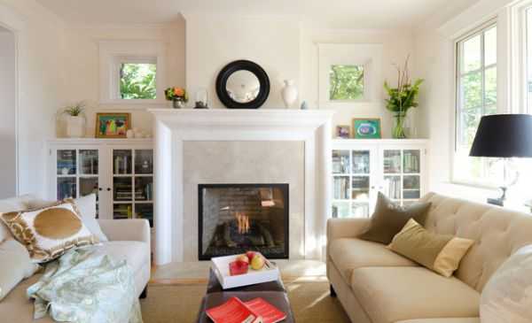 Добавив книжные полки по обе стороны камина, вы значительно сэкономите пространство, и добавите интерьеру немного симметрии. Сделав их немного ниже, вы не только добьётесь визуального баланса, но и весьма облегчите пространство.
