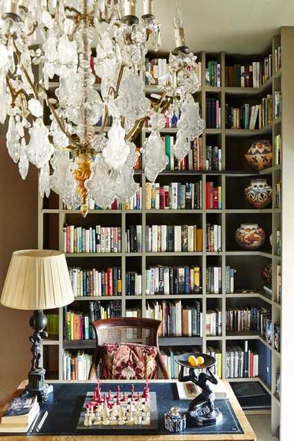 Дизайнер Хью Генри решил разбавить коллекцию книг в этом книжном шкафу уникальной коллекцией керамических изделий. Итальянская керамика 50-х и керамические изделия с этническими африканскими мотивами стоят рядом, украшая собой ряды книжных корешков.