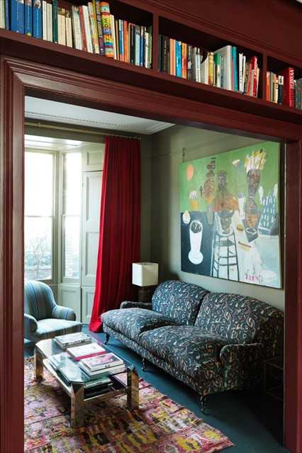 Оформление этой лондонской квартиры было переосмыслено дизайнером Адамом Брэем, сумевшим создать вдохновляющую и чувственную атмосферу в темных тонах. Громоздкие карнизы он заменил более простыми архитектурными элементами, а одну из гостиных превратил в библиотеку, в которой книжные полки встроены в ниши над дверной рамой.