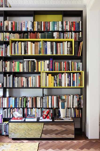 Этот викторианский дом в Лондоне получил новое оформление с использованием итальянских мотивов. Итальянский книжный шкаф в гостиной от фирмы B&B Italia в современном стиле выглядит особенно эффектно в контексте традиционного интерьера, и выглядит одновременно изящно и довольно солидно. Полированные бронзовые и желтые поверхности перекликаются с деталями оформления в том же цвете во всем интерьере.