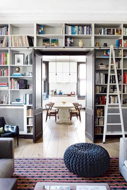 Изготовленные по индивидуальному заказу полки обрамляют двойные двери и искусно скрывают с глаз два радиатора в этом проекте от скандинавского дизайнера Эббы Тотт. Замечательная садовая лестница обеспечивает доступ к верхним полкам.