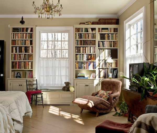 Можно создать великую стену вдохновения, то есть когда книги будут от самого потолка до пола. Особенно интересно такой вариант будет смотреться, если разместить книжные полки по всей стене, где есть окно. Прелестно смотрятся стопки книг на лаве у подножия кровати.