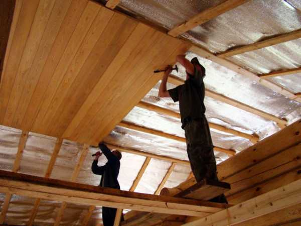 На фото обшивка потолка вагонкойОсуществлять установку материала желательно по схеме крепления, это позволит сделать монтаж быстро и просто. Помимо, собственно, древесины, потребуется еще утеплитель, к примеру, минеральная вата, которую следует проводить под обрешеткой, сохраняя целостность листа.