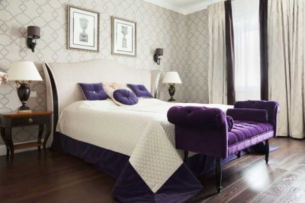 Спальня в фиолетово-бежевых тонах обеспечит приятные сновидения