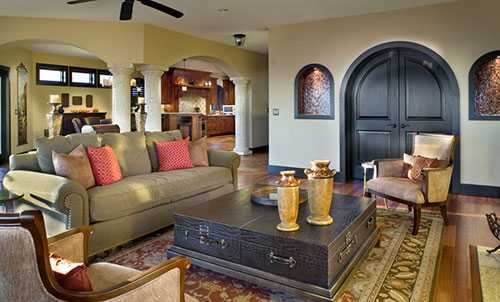 Гостиная комната, выполнена в стиле кантри, сочетает в себе простоту, уют, практичность. Такую гостиную не желательно наполнять современной техникой, а лучше дополнить камином или аркой