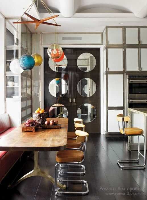 - Геометрические мотивы, которые просматриваются в оформлении пола, кухонного гарнитура, в дизайне стульев, создают узнаваемый ретро-образ, который ближе всего к эпохе 70-ых годов прошлого века.