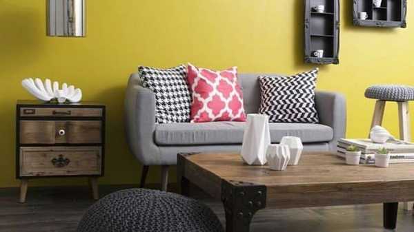 Самый безопасный вариант – сделать все стены светло-серыми. Если вы хотите крупное яркое пятно, оформите в желтый цвет одну стену за диваном.