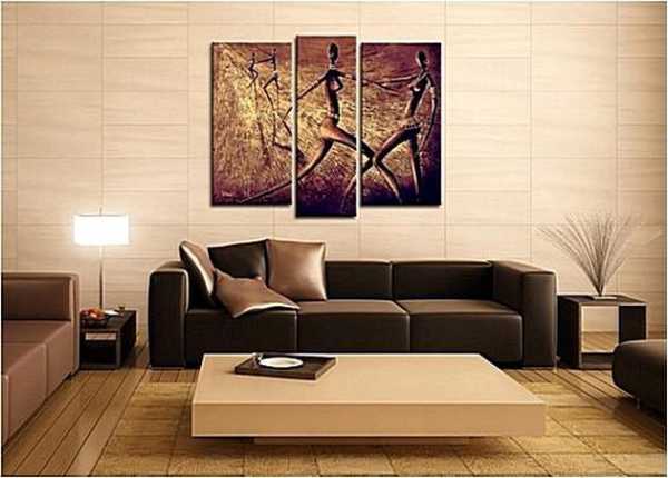 Для гостиной подойдут более объемные изображения с абстракцией, природными пейзажами или цветами. Такие картины выглядят аристократично и умиротворяющее. Вполне можно использовать сюжеты в японском стиле или даже африканском, как на картине ниже.