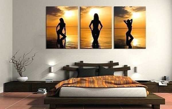 Для спальни наилучшим образом подойдут спокойные пейзажи, изображения цветов, ну и конечно же сюжеты легкой эротической направленности, если для вас эта тема еще актуальна. Это уже каждый определяет сам. Главное, чтобы вам в такой спальне было комфортно.
