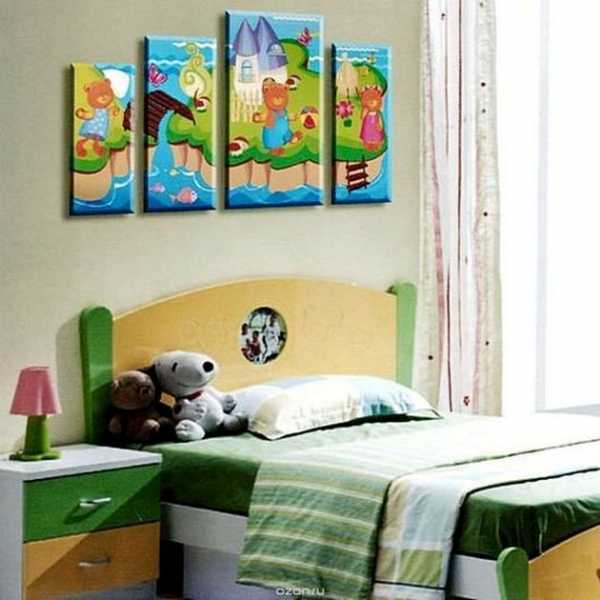 Для детской спальни нужно также выбирать картины в спокойных тонах с изображениями красивых пейзажей, цветов, героев известных мультфильмов, а также детенышей полюбившихся животных.