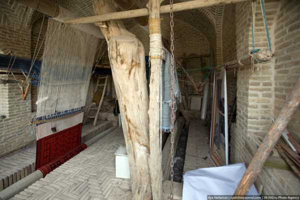 Как ткут ковры на самом деле, никто не знает, но туристам показывают эту машину. Станок представляет собой деревянную раму, на которую между верхней и нижней перекладиной натягивают полотно. Оно состоит из продольных нитей, расположенных близко друг к другу (качество ковра зависит, кроме прочего, и от плотности расположения и толщины нитей). На этих нитях завязаны шерстяные пучки, которые формируют ворс ковра. Когда один ряд узлов по ширине ковра завершается, вводится дополнительная поперечная нитка (чаще всего хлопчатобумажная) для того, чтобы придать узлам и всему изделию прочность и форму. Этот процесс повторяется ряд за рядом до тех пор, пока не сформируется весь ворс ковра. Затем следует последняя часть операции: стрижка ворса. Он должен быть пострижен по всей длине до толщины объема шерстяных нитей. Таким образом, формируется плотный и густой ворс. От плотности узлов зависит четкость рисунка.