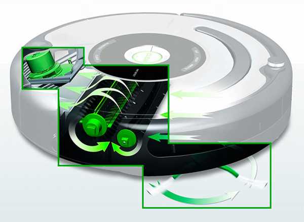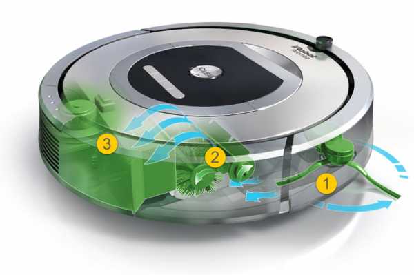 Принцип работы робота пылесоса для сухой уборки таков: с помощью различных датчиков и программному обеспечению прибор двигается по комнате и всасывает пыль и грязь под собой. Помогают ему, как правило одно – две боковых щеток для уборки с мест, куда он не может подъехать, к примеру, под стенкой. И одной – двух щеток под корпусом для захватывания более крупного мусора и втягивания его в пылесборник.