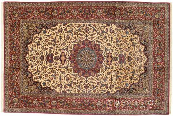 Чаще всего ковер из Исфахана можно узнать по характерным доминирующим карминовым, кремовым и синим орнаментам на бежевом поле (слоновая кость). Характерный карминовый или кремовый цвет присутствует в исфаханских коврах практически всегда.