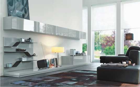 - «открытый доступ» — от двухсторонних стеллажей, которые могут использоваться как перегородки, до самостоятельных полок, словно плывущих по стенам;