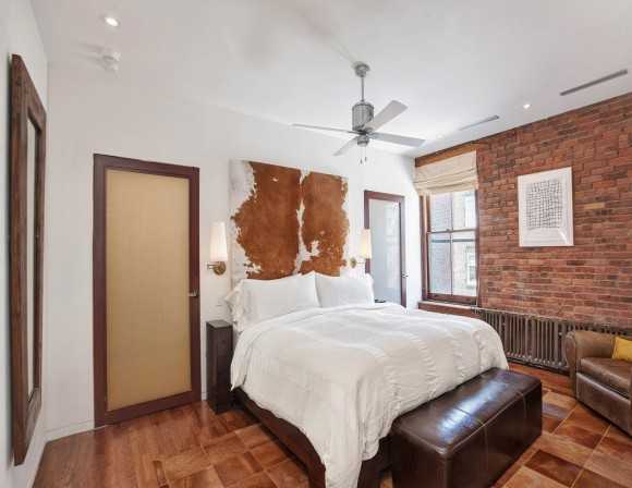 Часто спальню объединяют с ванной, разделив зоны стеклянной перегородкой. Подчеркнуть стиль помещения поможет железная кровать или деревянный предмет из грубого дерева. В помещении приветствуются зеркала, визуально увеличивающие пространство. В интерьере присутствует много светильников. Они крепятся на балки, стены, используются рельсовые системы освещения.