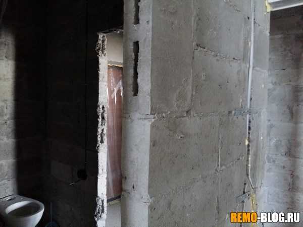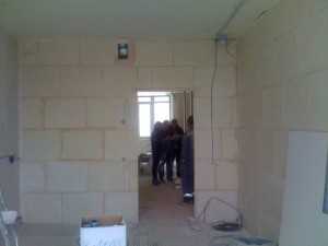 Когда ряд блоков будет уложен, необходимо сделать перерыв на полчаса для схватывания раствора. Перегородку необходимо зафиксировать с помощью дюбелей к несущей стене. Для обеспечения должной звукоизоляции необходимы двойные перегородки.