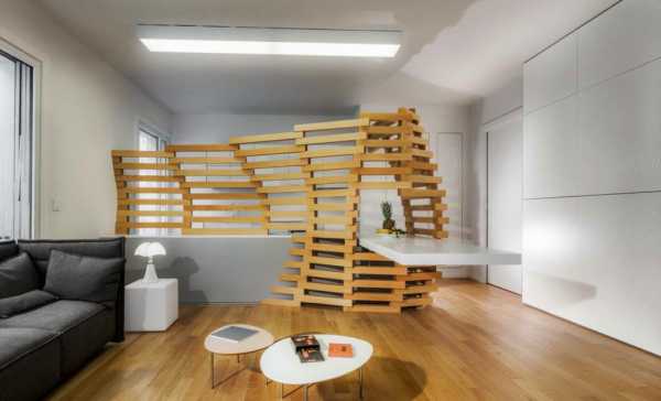 Отлично вписываются в нынешние интерьеры перегородки в виде вертикальных жалюзи из дерева, поворачивающихся вокруг своей оси. Особенно это актуально для тех декоров, где древесные тона и фактуры имеют приоритет.