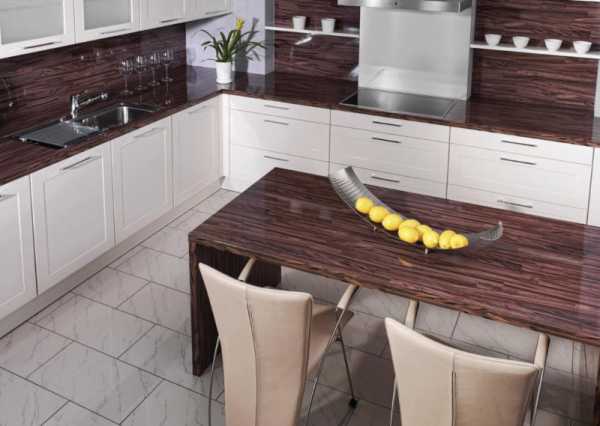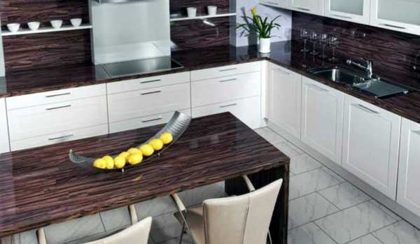 Плюсы: Просто восхитительный внешний вид, над рисунком которого будто бы постаралась сама природа. Рисунок каждой из таких столешниц неповторим, поскольку его создала природа. Материал не боится ни воды, ни высоких температур и считается одним из самых долговечных.