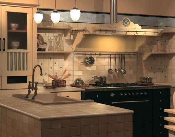 - Плитка керамическая. Такая столешница – идеальный вариант для поклонников стиля кантри в дизайн маленькой кухни студии. Натуральность материала – это единственный ее плюс. Минусов же гораздо больше.