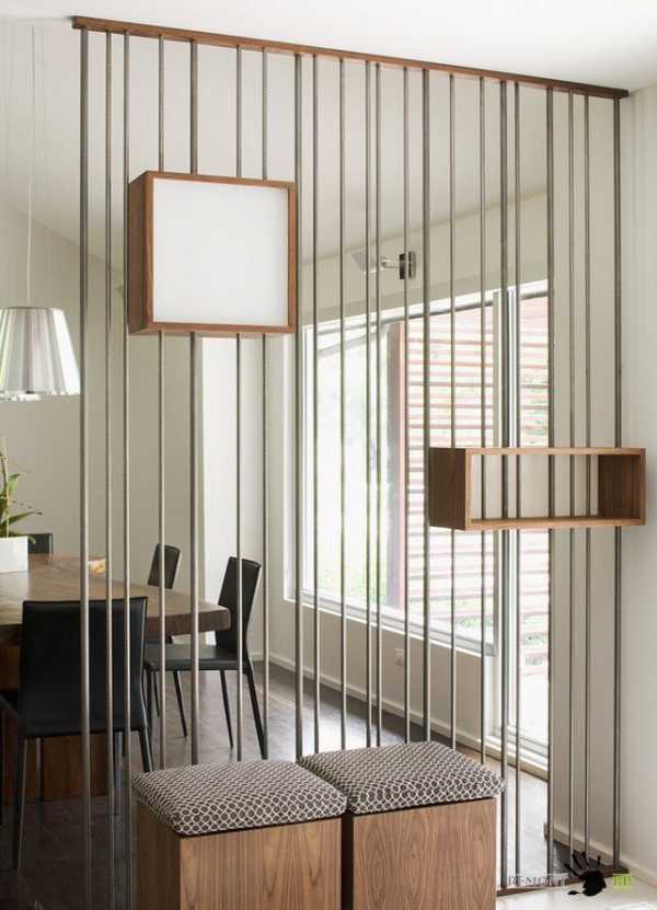 Так называемые перегородки-экраны представляют собой опоры, к которым крепится основной материал по типу экрана. В зависимости от сложности самой конструкции и выбранного материала опор и экранов, подобные перегородки можно установить как с помощью специалистов, так и самостоятельно. Конструкции достаточно прочные, но не настолько, чтобы крепить к ним полочки или ящики. Плюсом является то, что несмотря на вполне очевидное зонирование, полностью освещение из одной комнаты в другую не изолируется.